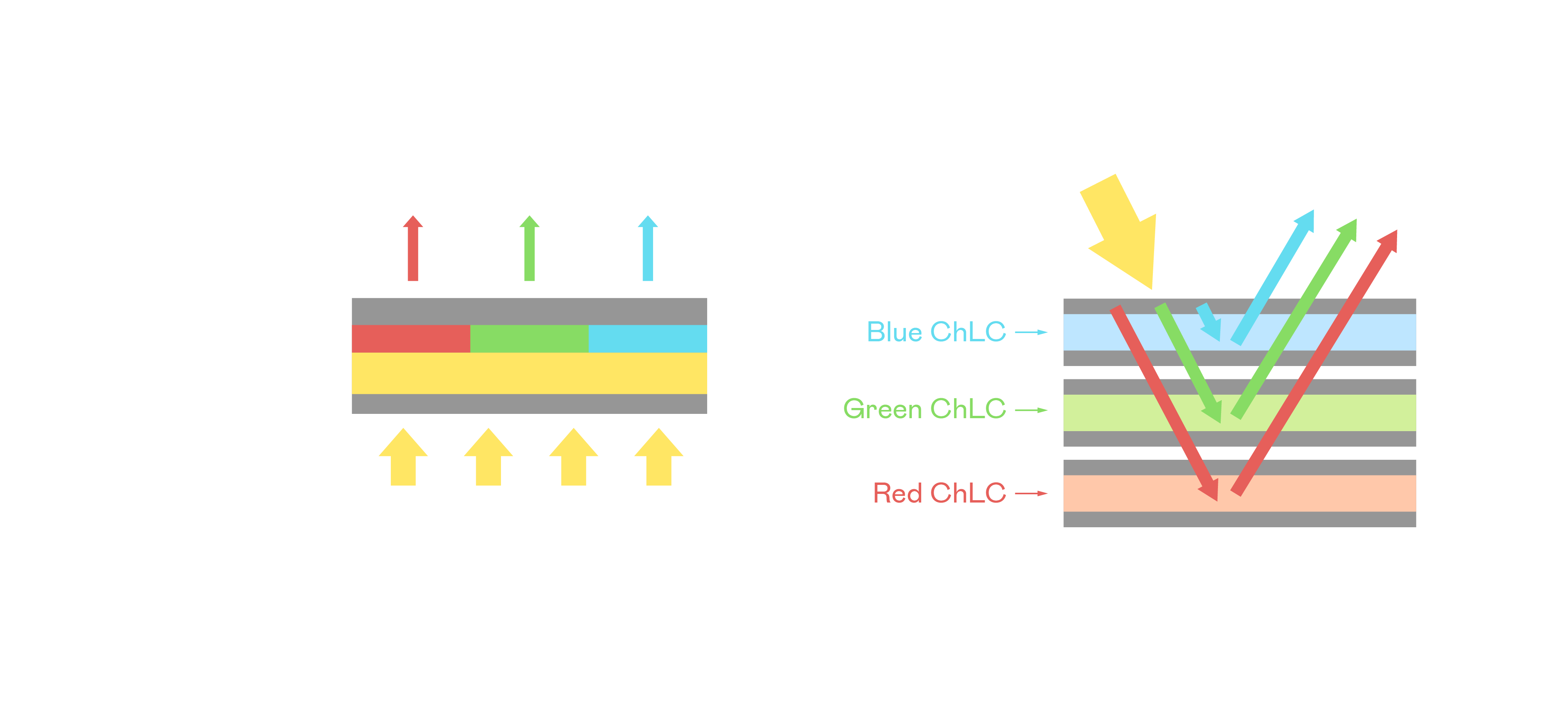 来利国际w66胆固醇液晶显示器是由红、绿、蓝三层胆固醇液晶面板堆叠而成,并采用无彩色滤光片设计,减少环境光在反射过程中的损耗。