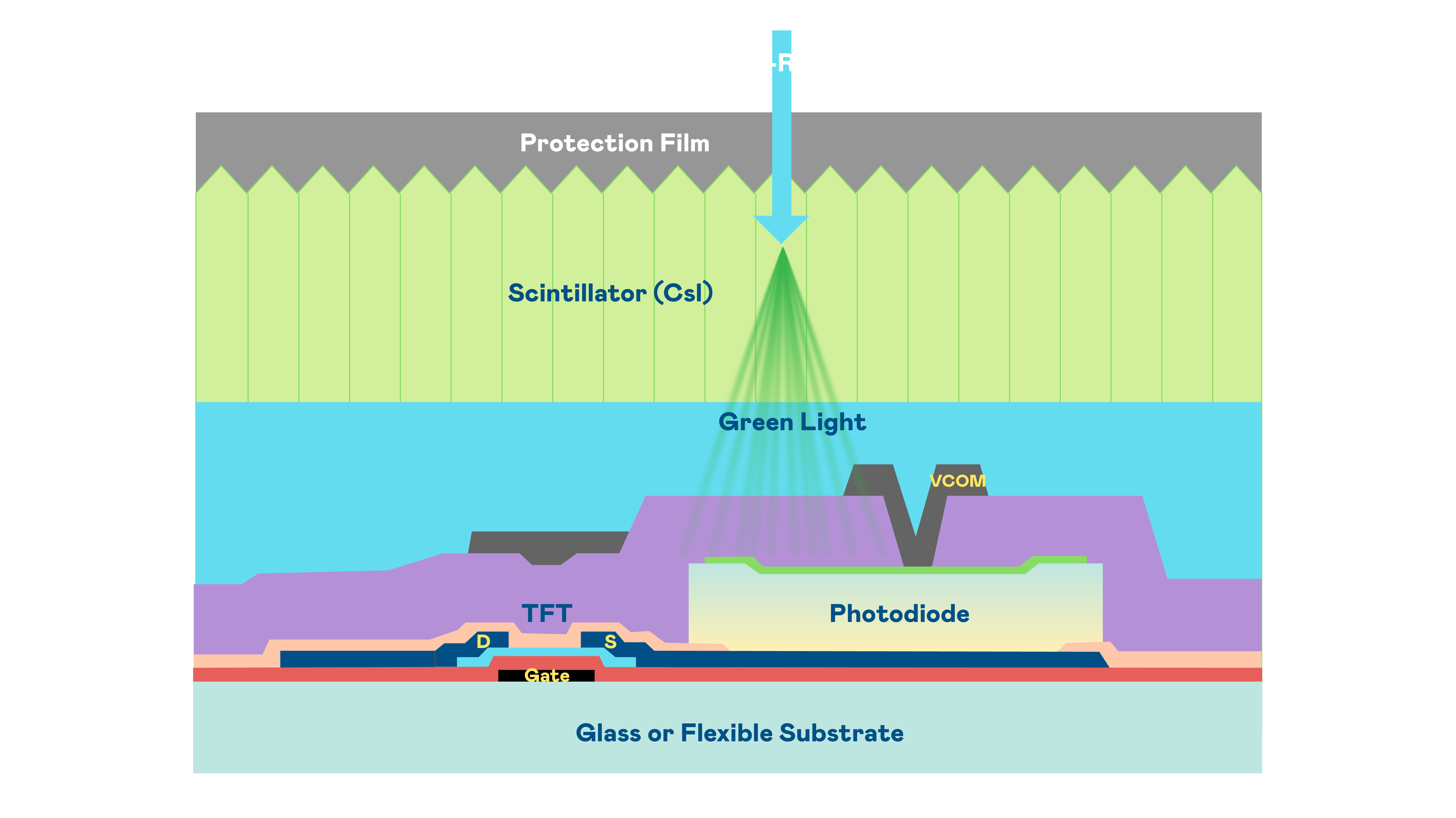 来利国际w66的X光影像感测阵列使用薄膜电晶体 (TFT) 作为每个像素的读取开关,搭配光电二极体(Photodiode)的光电转换元件,用以感测X光影像讯号。